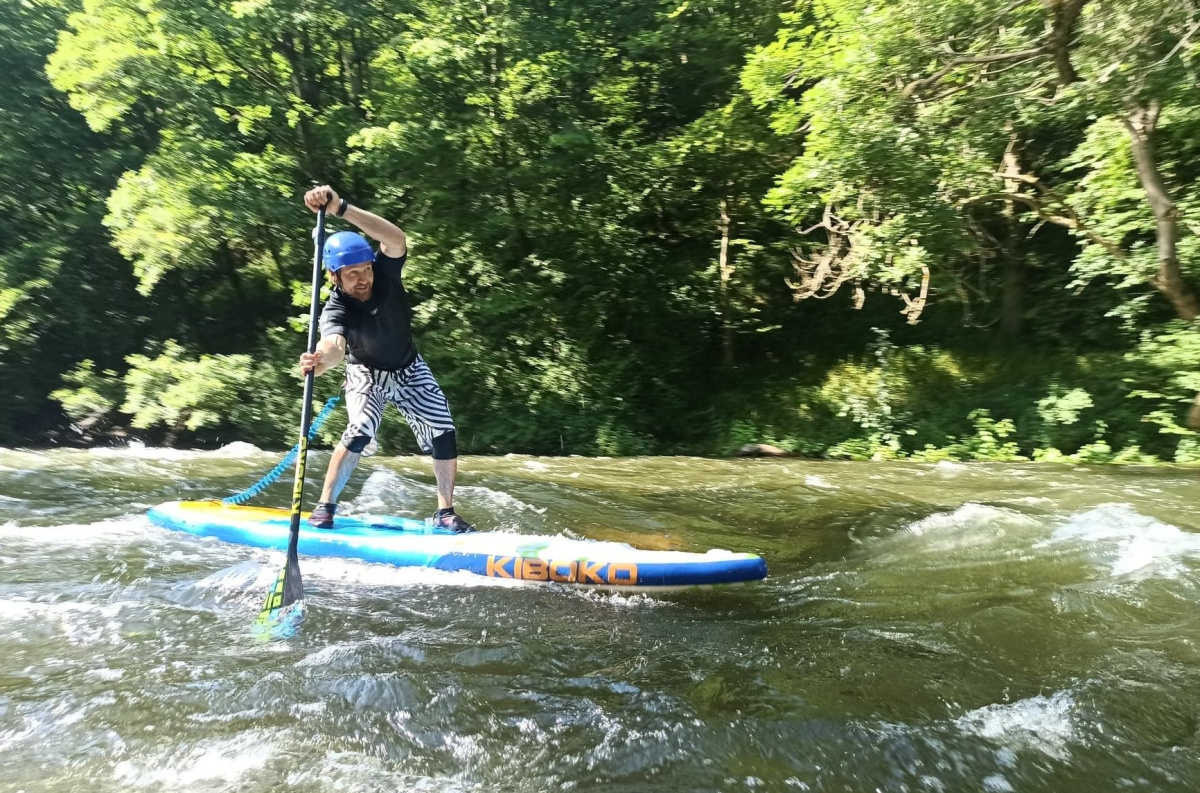 Karbonové SUP kajakové pádlo Kiboko se dvěma plastovými listy – nastavitelné pádlo s vysokým obsahem karbonu v žerdi a odolným, středně velkým listem. Špičkové sportovní pádlo a nejlepší volba pro jízdu v mělké vodě (např. na řece), kde by hrozilo případné poškození kompozitového listu. Ergonomická plastová hlavička pádla ve tvaru „T“ umožňuje velmi dobrý přenos sil a čtyřicetiprocentní podíl sklolaminátu v žerdi zvyšuje pružnost pádla i při méně dynamickém záběru.