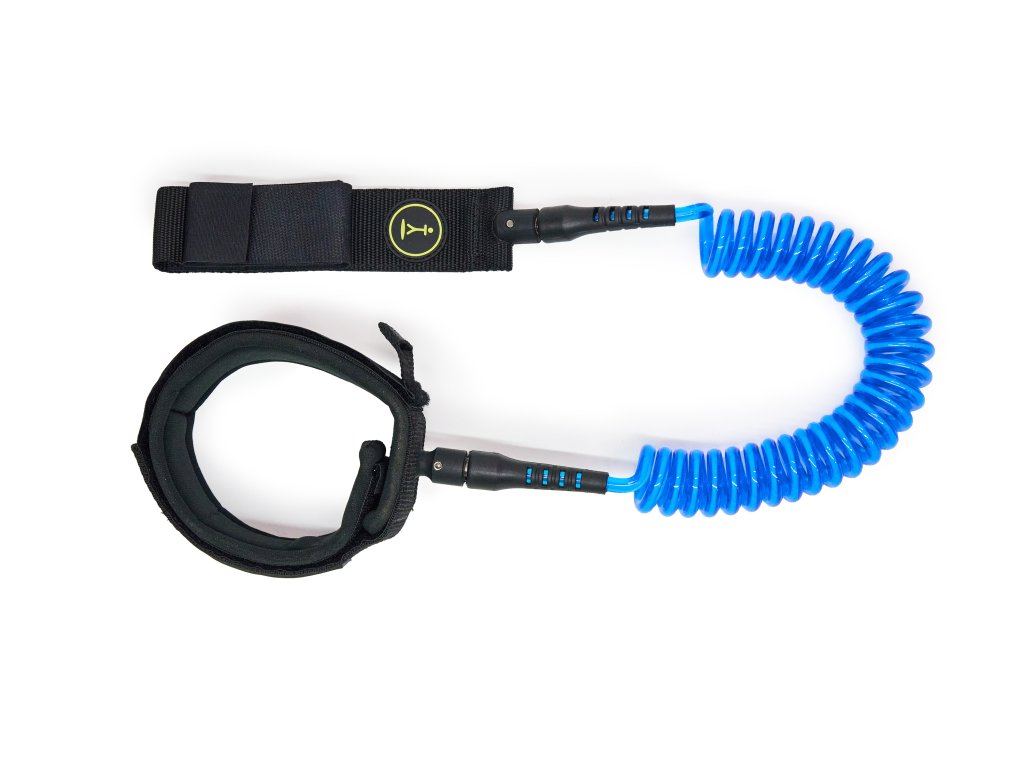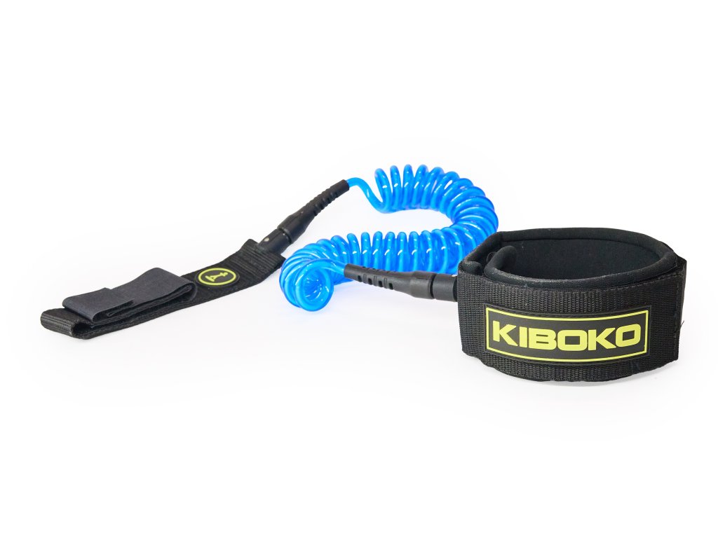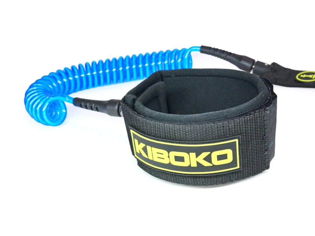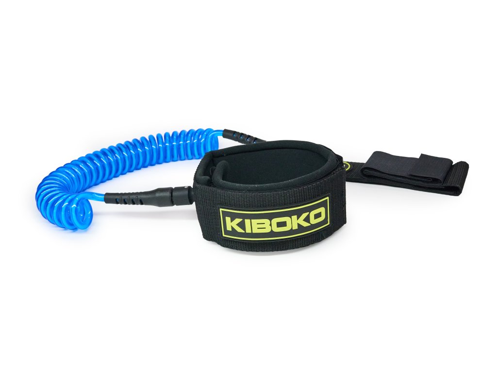 Leash Kiboko pod koleno - stočená připevňovací šňůra, která se používá především pro jízdu v silném větru nebo na volném moři, kde hrozí při pádu z paddleboardu jeho ztráta (uplavání).