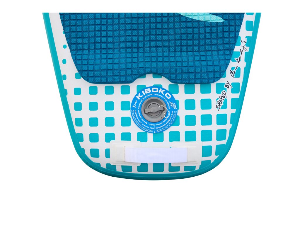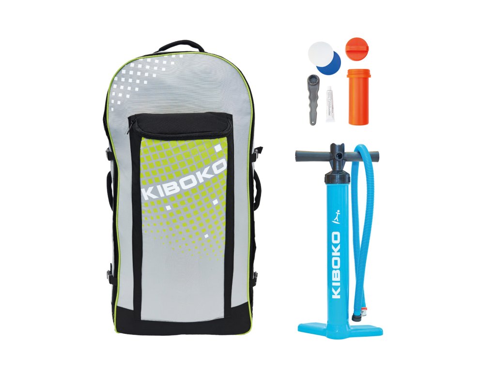 Součástí balení v ceně paddleboardu je pevný a prostorný batoh Kiboko vyrobený z recyklovaných PET lahví a ruční obousměrná pumpa Kiboko.
