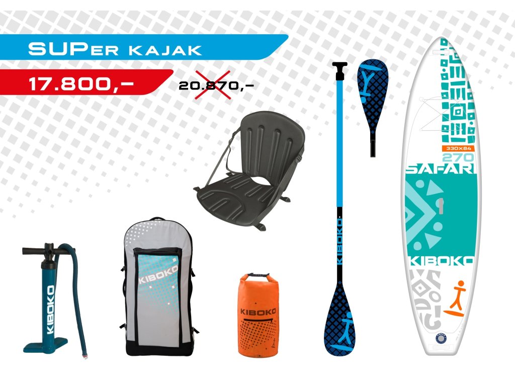 SUPer kajak Safari 270 + Pumpa Kiboko + Batoh Kiboko + Hliníkové pádlo + přídavný list na kajak + kajakové sedátko Yaté + nepromokavý batoh