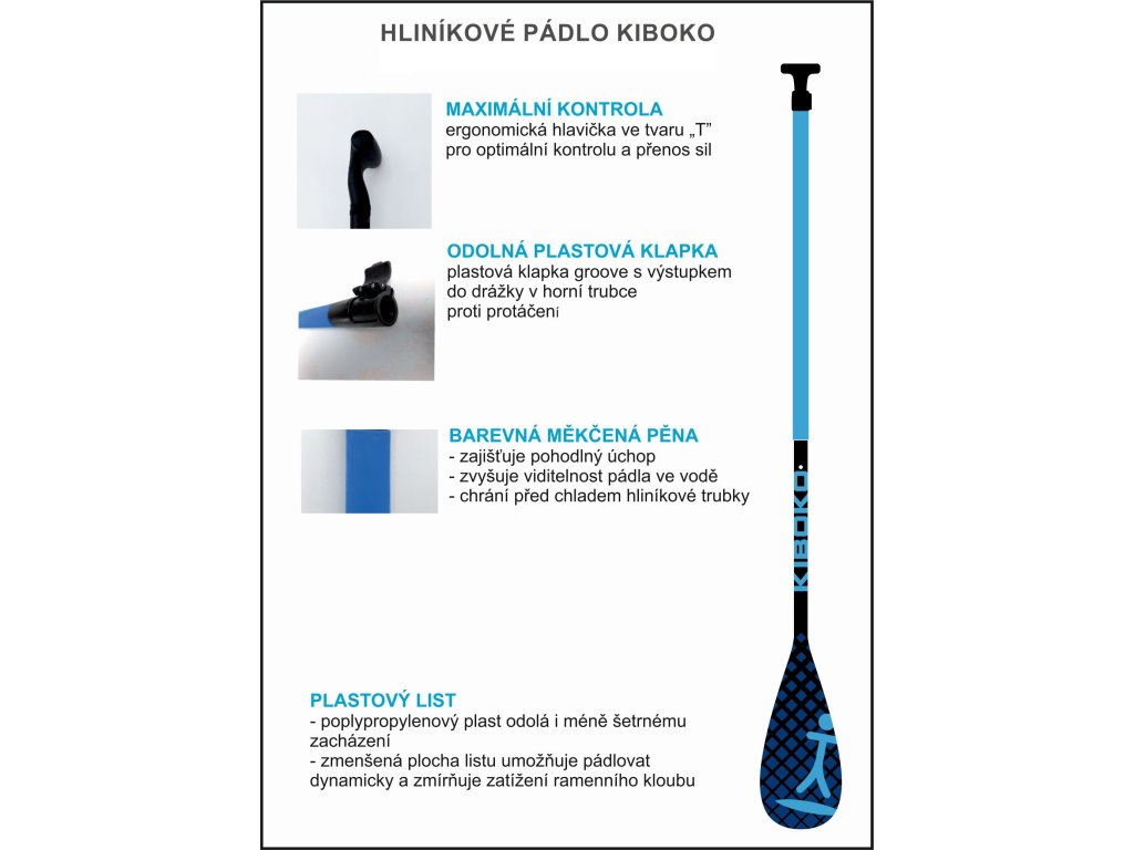 Hliníkové SUP kajakové pádlo Kiboko – nastavitelné hliníkové pádlo s plastovým listem. Středová trubka (žerď) je obalena napevno nalepenou měkčenou pěnou pro pohodlnější úchop a při nižších teplotách chrání před chladem. Ergonomická plastová hlavička pádla (hruška) ve tvaru „T“ umožňuje maximální kontrolu i ve ztížených podmínkách na moři nebo v peřejích