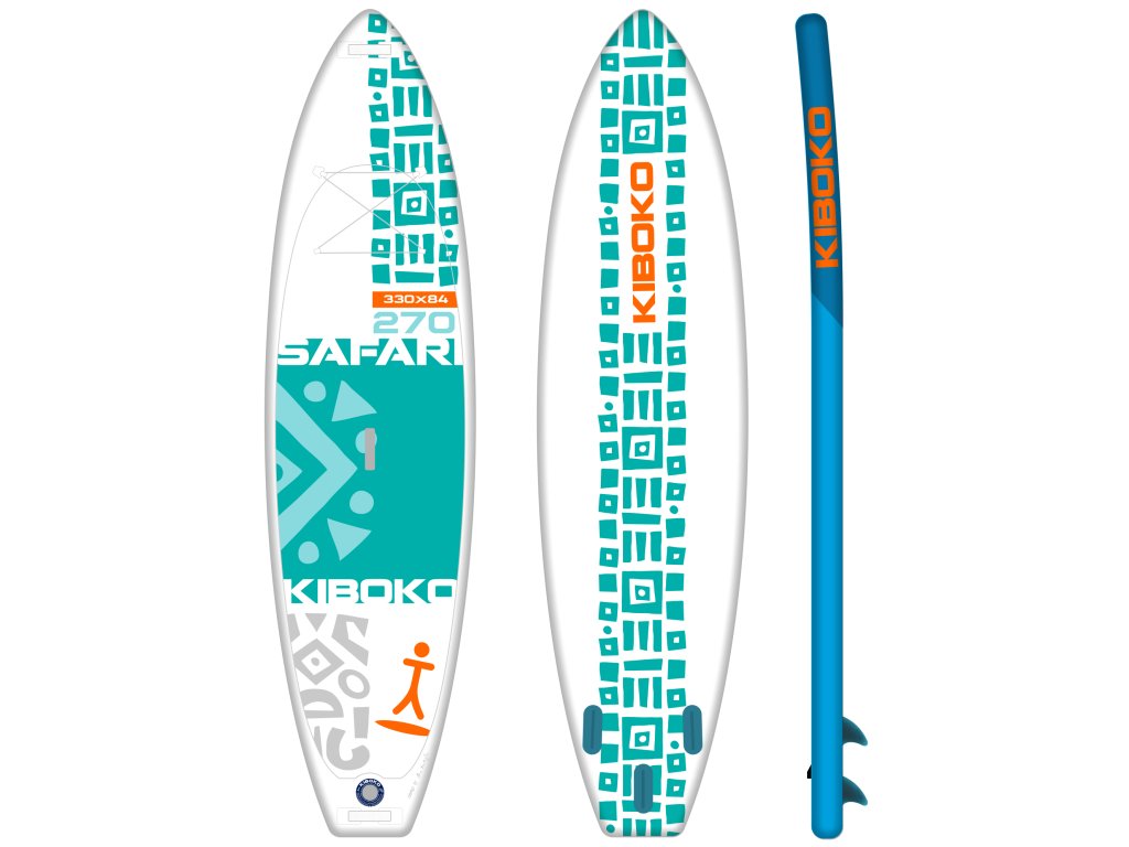 Safari 270 je osazené třemi napevno nalepenými ploutvičkami. Fixní ploutvičky jsou pružné, odolné a vyznačují se tvarovou pamětí, proto se nemusíte obávat jejich poškození. Součástí balení v ceně paddleboardu je pevný a prostorný batoh Kiboko vyrobený z recyklovaných PET lahví a ruční obousměrná pumpa Kiboko.